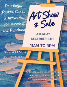 The Senior Painting Class hosts an Art Show and Sale to coincide with the Williamstown Holiday Walk. Shop paintings, prints, cards and artworks. A portion of all sales funds art supplies for the class and a chosen cause.
