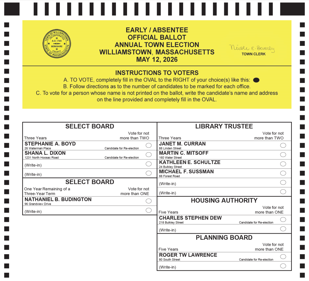 Williamstown Annual Election takes place Tuesday, May 12, 2026 from 7:00 AM until 8:00 PM at Williamstown Elementary School. This is your opportunity to choose who represents you on the Select Board and other elected committees.